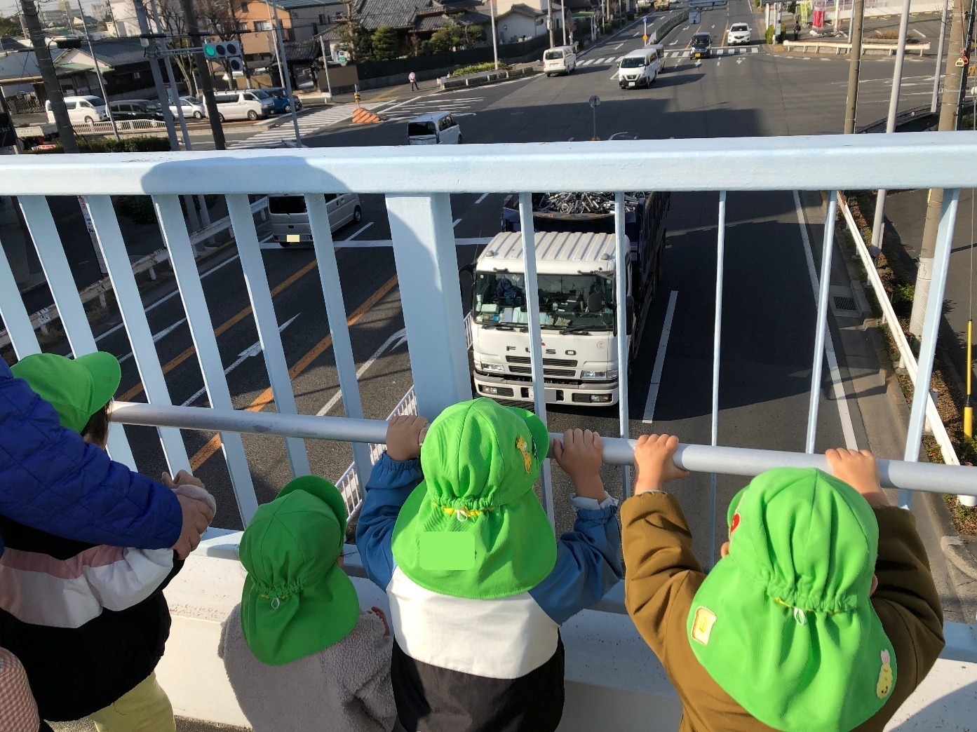 歩道橋から車を見たよ。お兄さんが手を振ってくれたんだ!