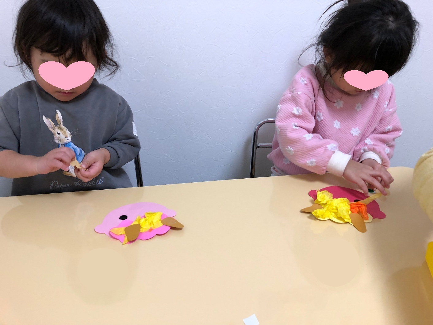 鬼の髪の毛はお花紙で~、今度はおめめをシールでぺた‼