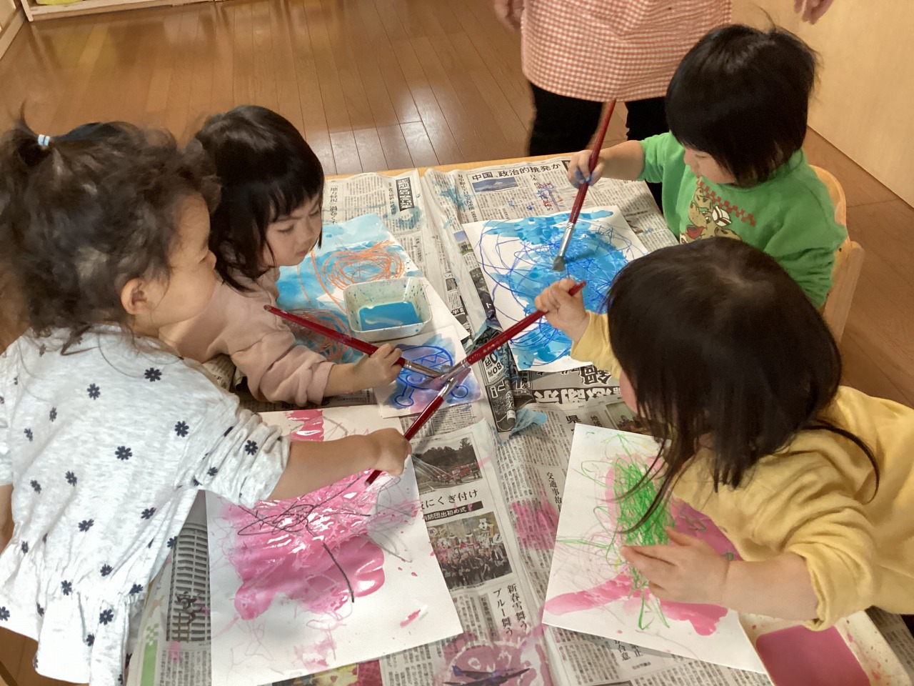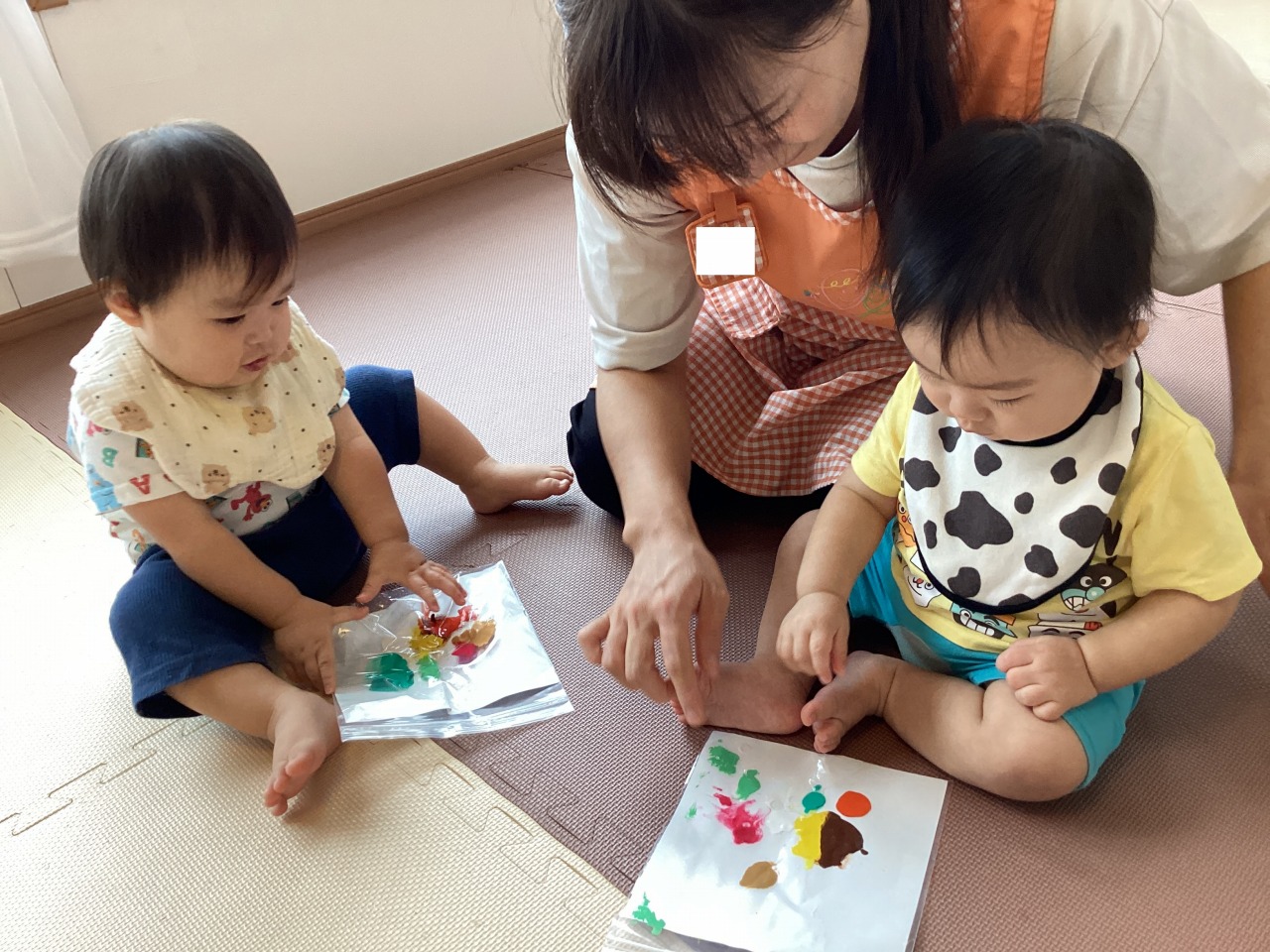 絵の具遊びが大好きなみんな。手にもペタペタ!気持ちいいね