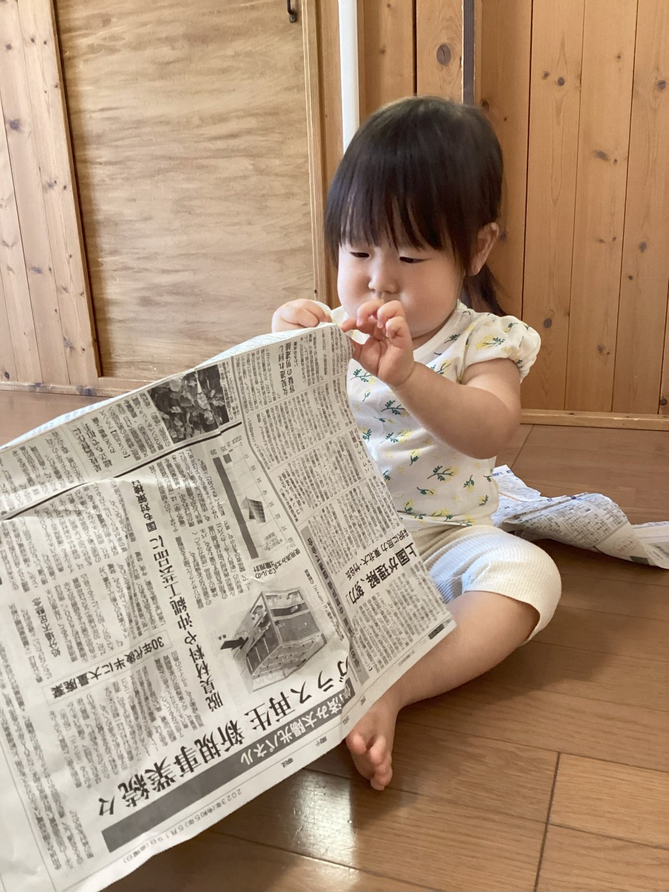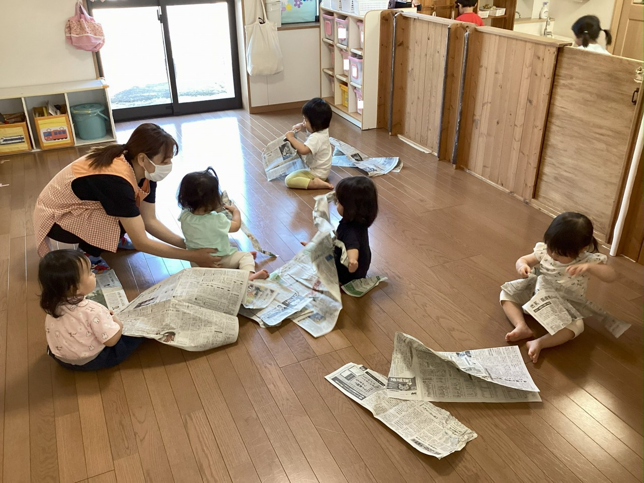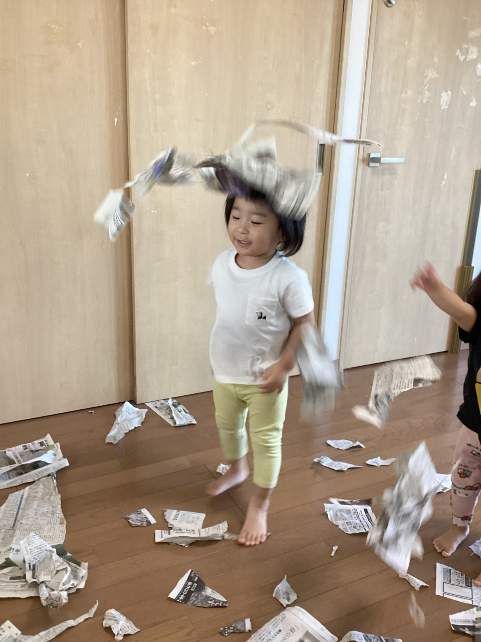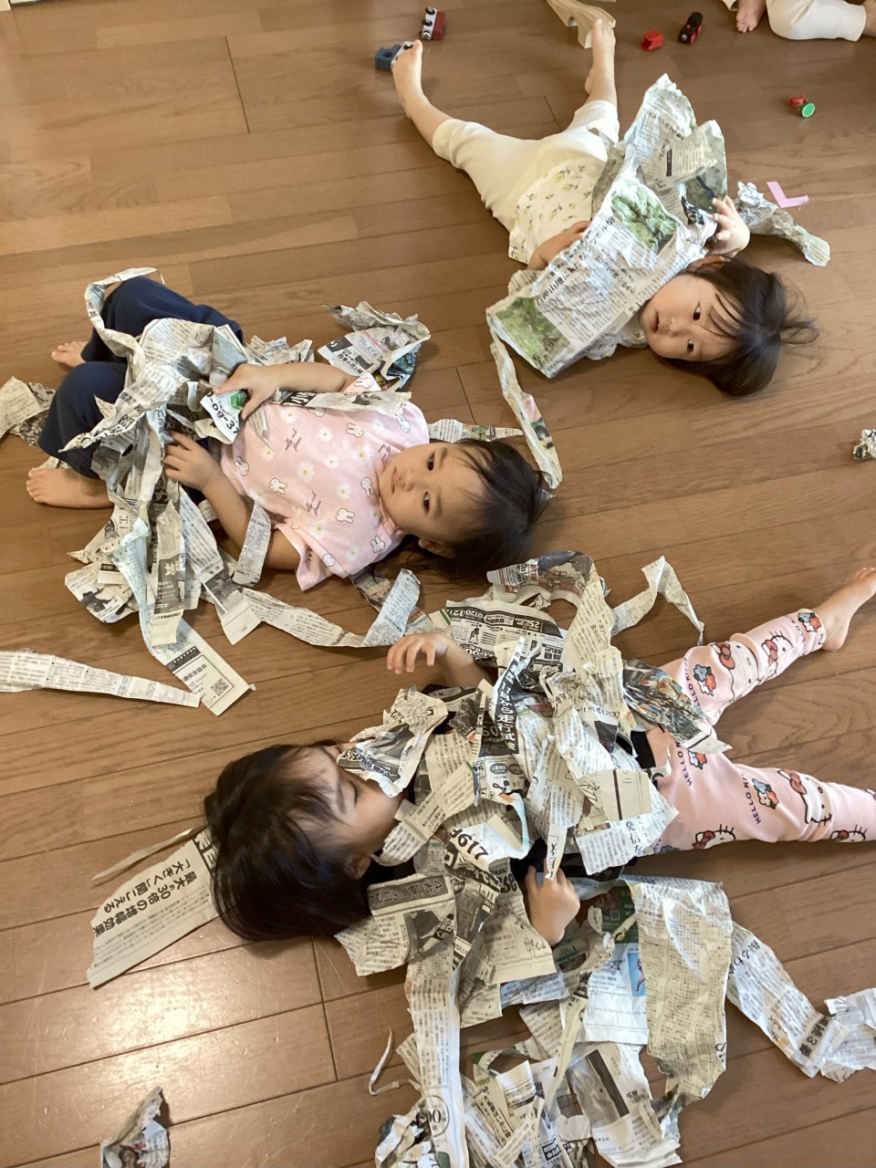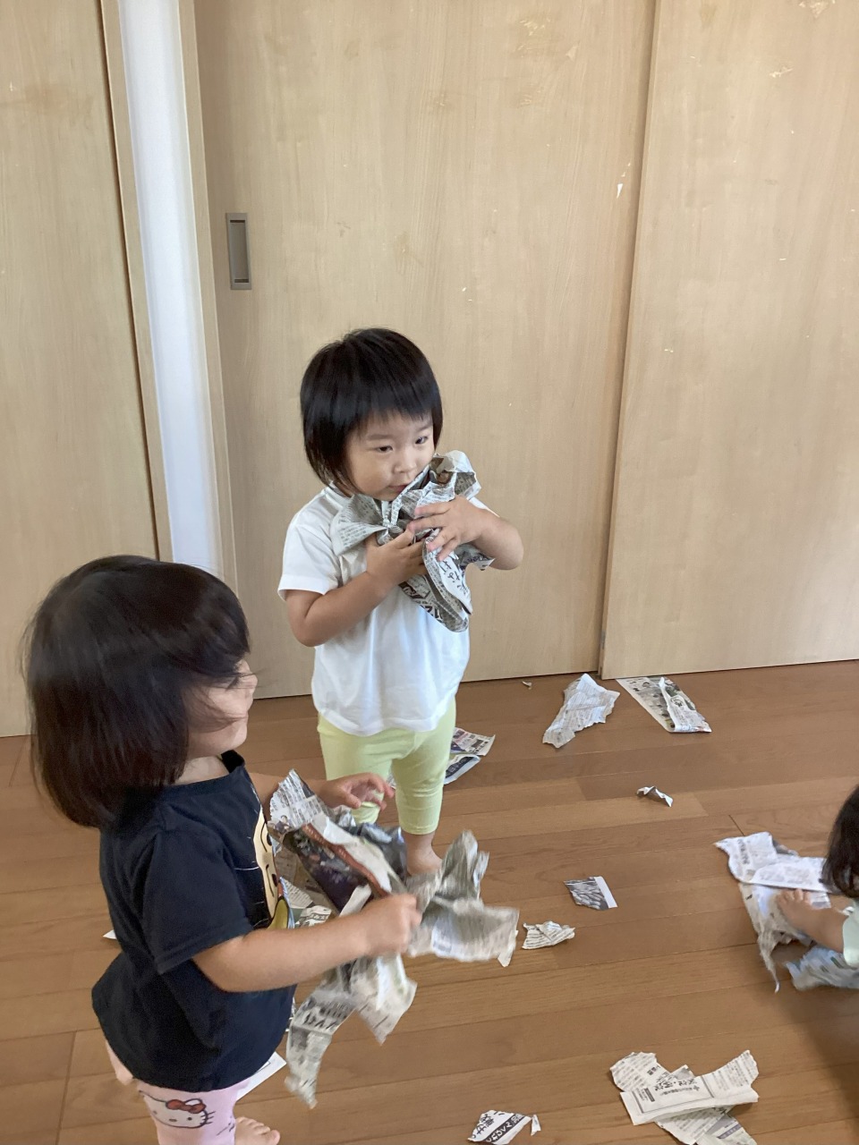 新聞紙遊びの様子です。さぁ、ビリビリしますよー!
