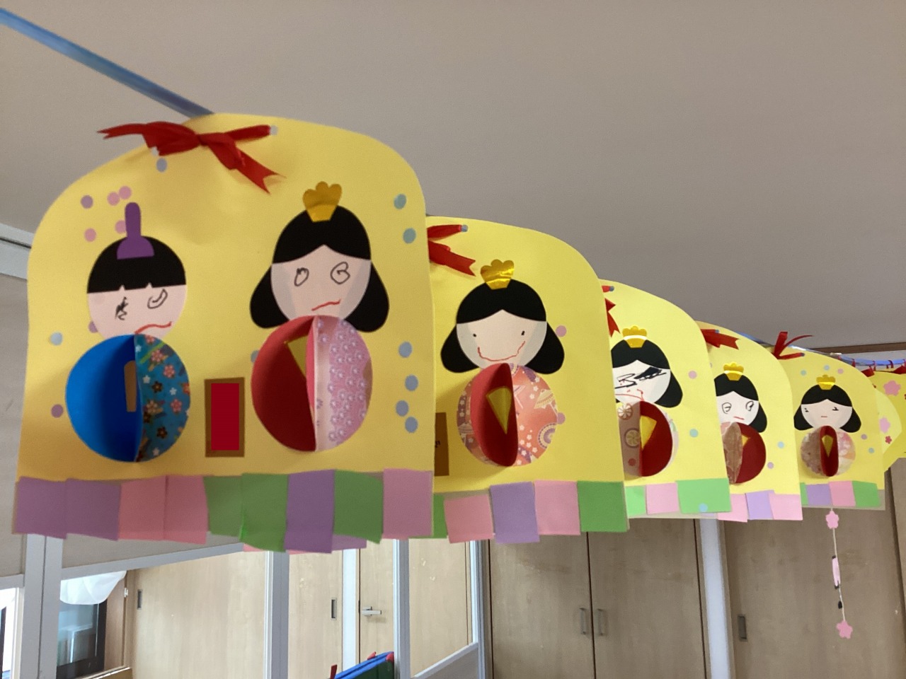 そら組さん。クレヨンで着物を塗って、シールでお顔を付けました。