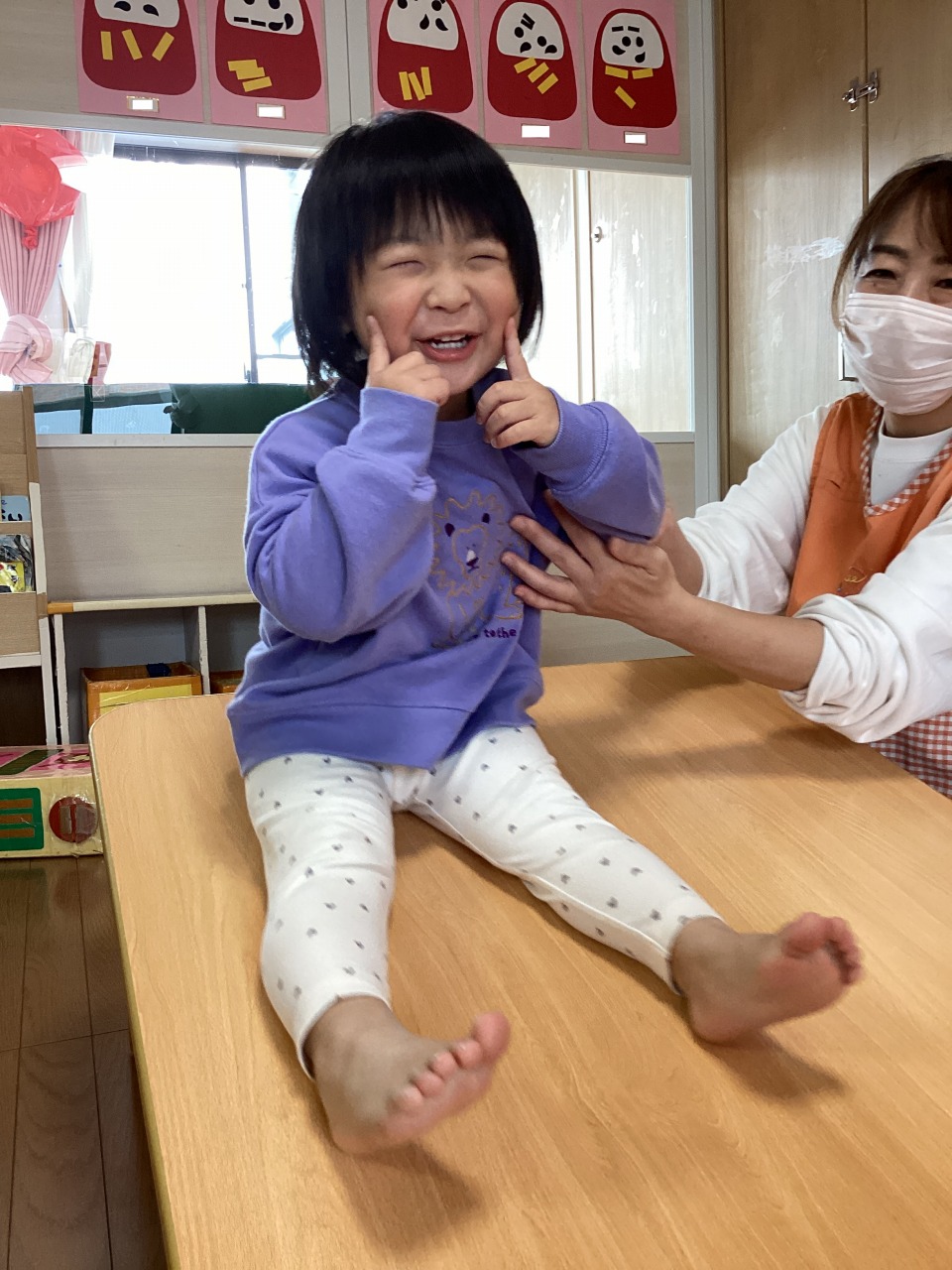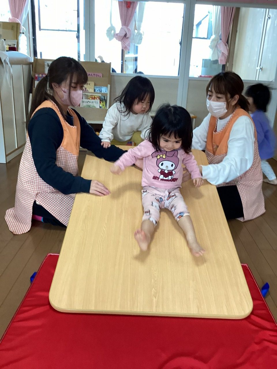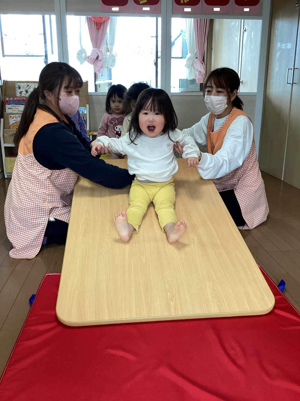 そら組さんの様子。テーブル滑り台に挑戦!