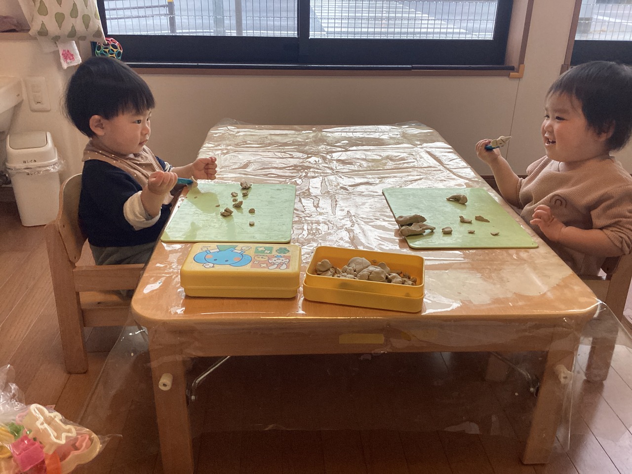 向かい合って仲良く粘土遊びです。「楽しいね」「うん、楽しいね」