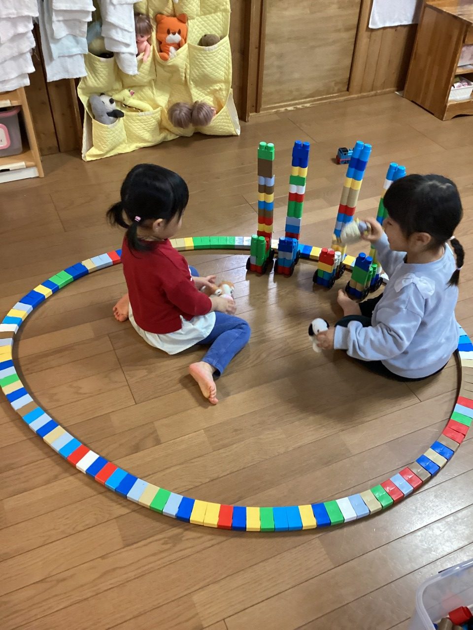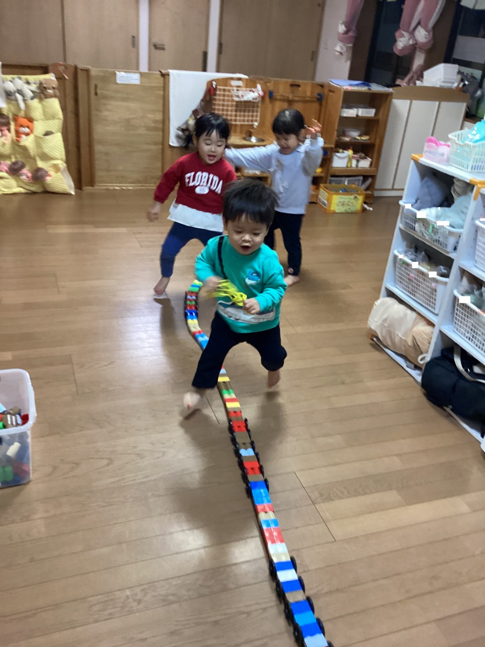 お友だちとで協力してブロック長~く繋げたよ!それ行け、ぴょんぴょん!