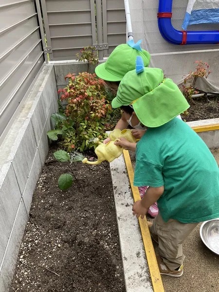 食育にも力を入れており、野菜の苗を植え、みんなで大切に世話をし、収穫を喜び、給食になるまでの過程を楽しんでいます。