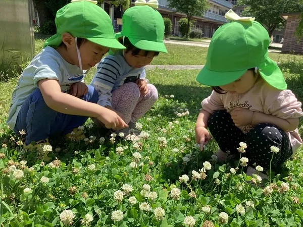 遊びを通して育つ力を大切にしており、天気の良い日はどのクラスも戸外に出て元気いっぱい遊んでいます。草花を摘んで調べたり虫探しを楽しんだり、遊びたい場所も、遊ぶ物も自分で決め、夢中で遊びこむ力を育んでいます。