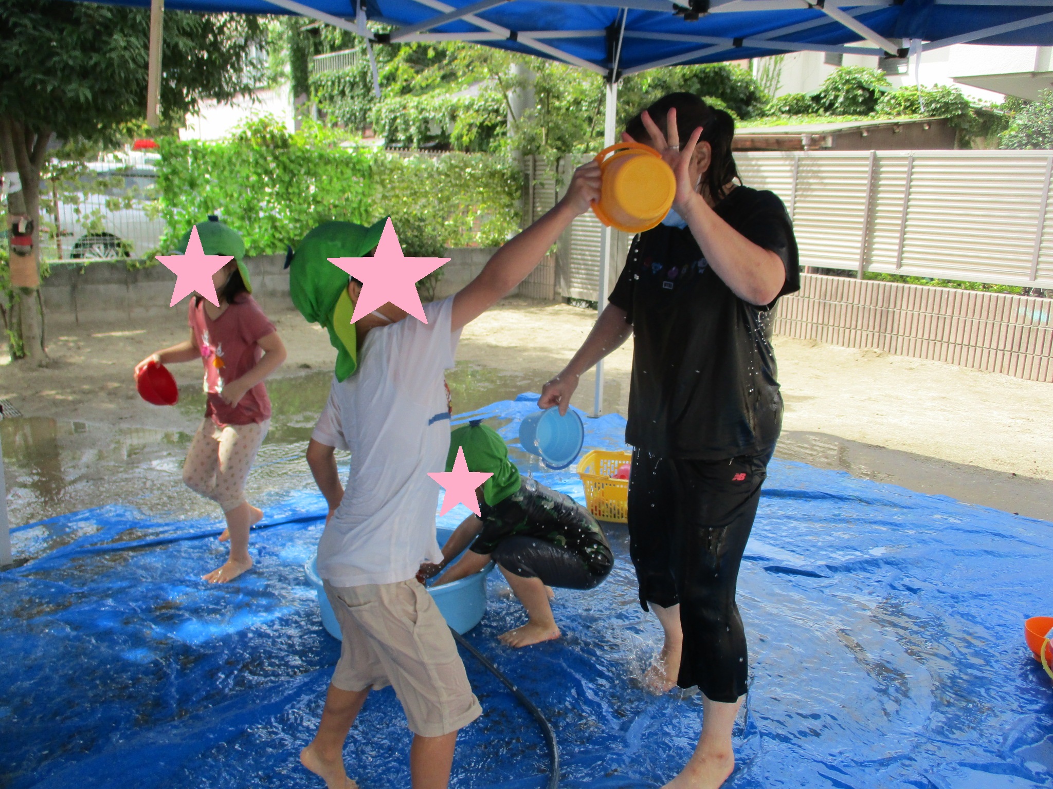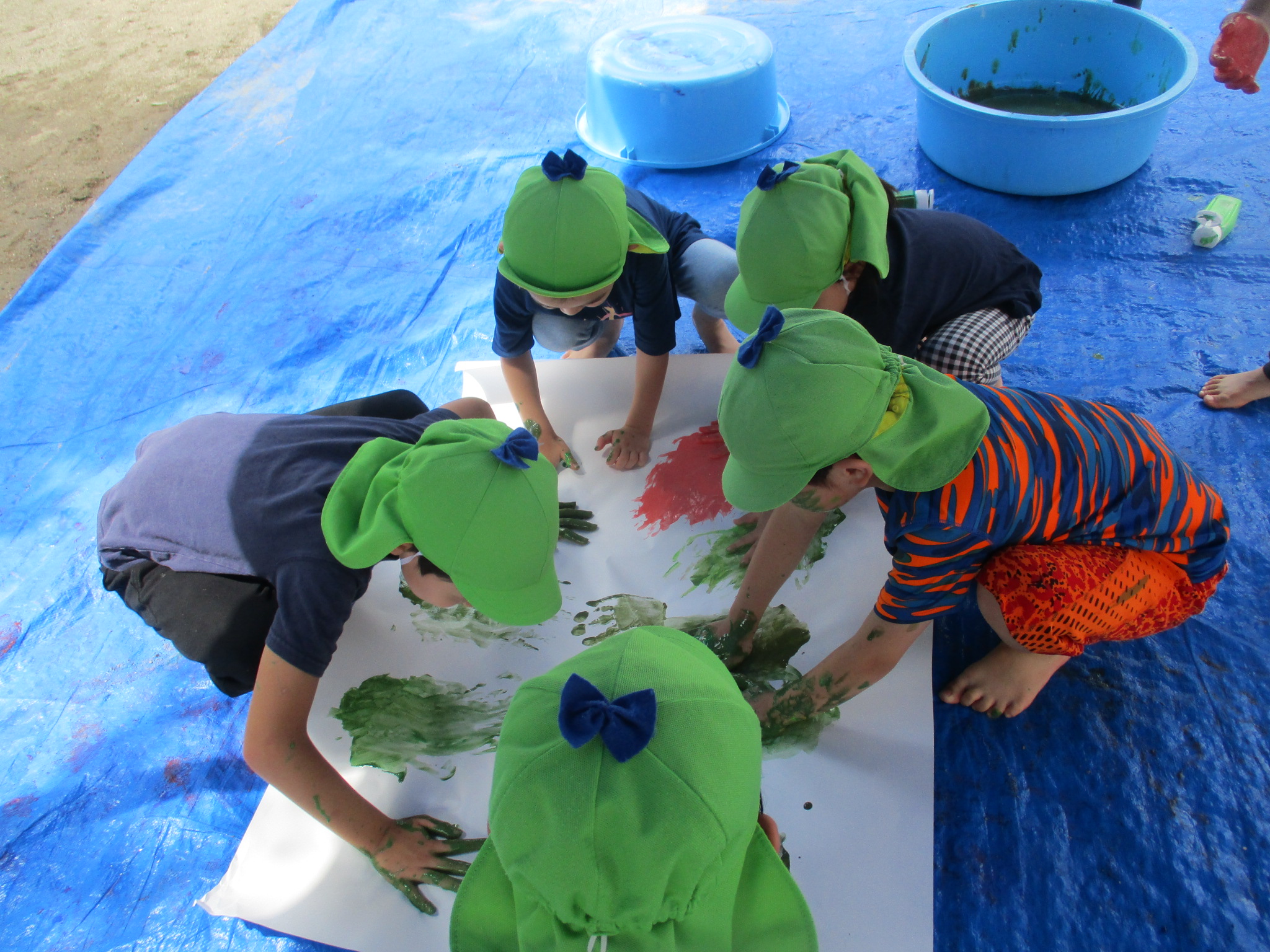 園庭は木々のほか2023年5月より芝生となり、緑に囲まれ芝生の感触を楽しみながら蟻や蝶・ダンゴムシなど自然に触れて遊んでいます。吹く風とともに時々芝のにおいが漂い、芝の上を寝転ぶ様子も見られています。