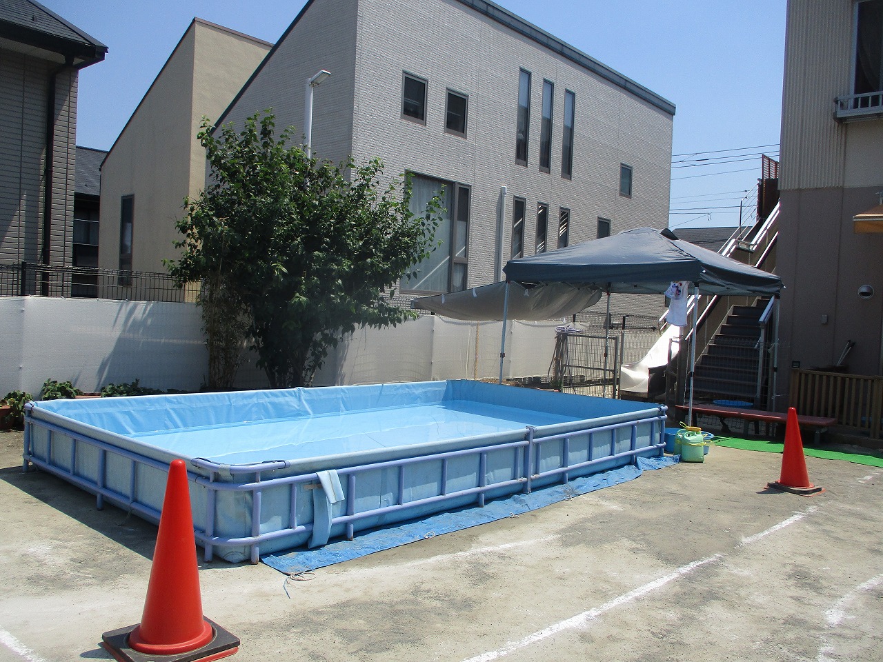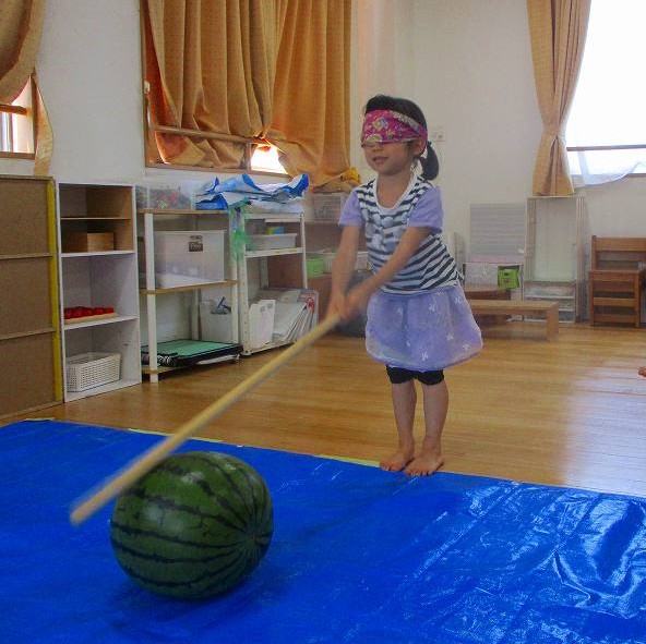 園庭が広いのも特徴の一つです。子どもたちが能動的に遊べるように固定遊具を置かず、ボールや、フラフープ、ポックリ、縄、ゴザ、コンテナ等の環境を整えています。子どもたちは主体的に、ごっこ遊びや見立て遊び・つもり遊び、ルールのある遊びなどを楽しんでいます。幼児組では園庭全体を使用し、サッカーや野球、ドッヂボール、リレーなども楽しめ十分に身体を動かして遊んでいます。