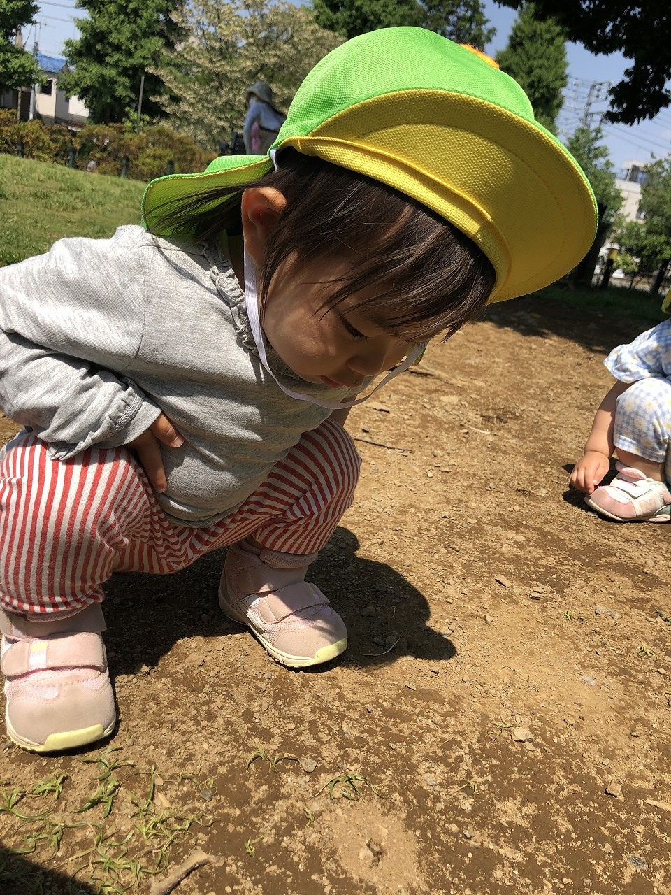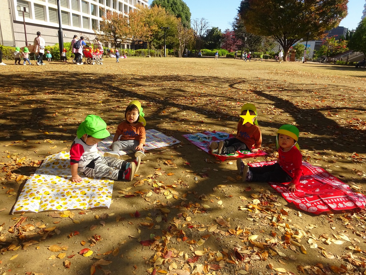 園庭はありませんが、毎日公園や公共施設に散歩に行くことで、体力や歩く力、公共施設でのルールを身につけ、心身ともに健やかに育つように関わっております。また、子どもたちがのびのびと安心して笑顔で過ごせるように、全職員で全園児の成長を見守っていきます。