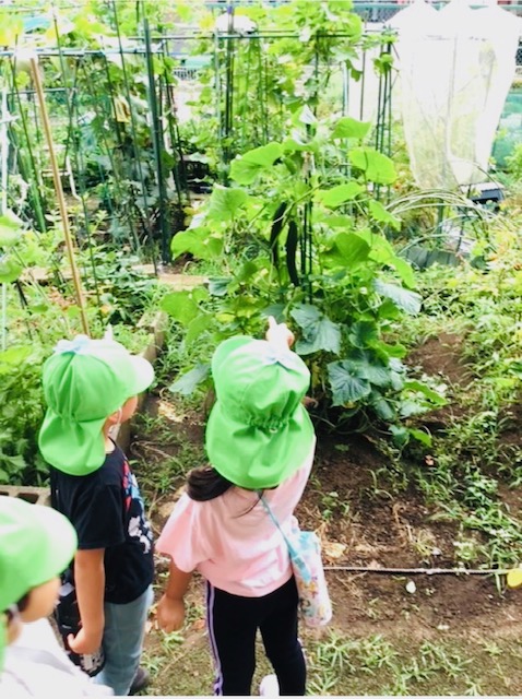 園周辺には区民公園をはじめとする公園がたくさんあり、子どもたちは自然を身近に感じながら楽しく遊んでいます。食育にも力を入れており毎年キュウリ・ナス・ピーマンなどの野菜を育てています。また地域の方々のご協力により近隣にある区民農園にお邪魔して畑の見学をさせていただいています。様々な野菜に触れ地域の方に野菜が育つまでのお話を伺い成長する過程を学びます。育てる・作る・食べるといった体験を積むことで子どもたちの豊かな感性を育てていきます。保育園で積み重ねる多くの体験が、子ども達の心に将来への力として育まれ思い出となるように願いながら一人ひとりへのあたたかな関わりを大切に、職員間で連携を取り合い保育を進めてまいります。