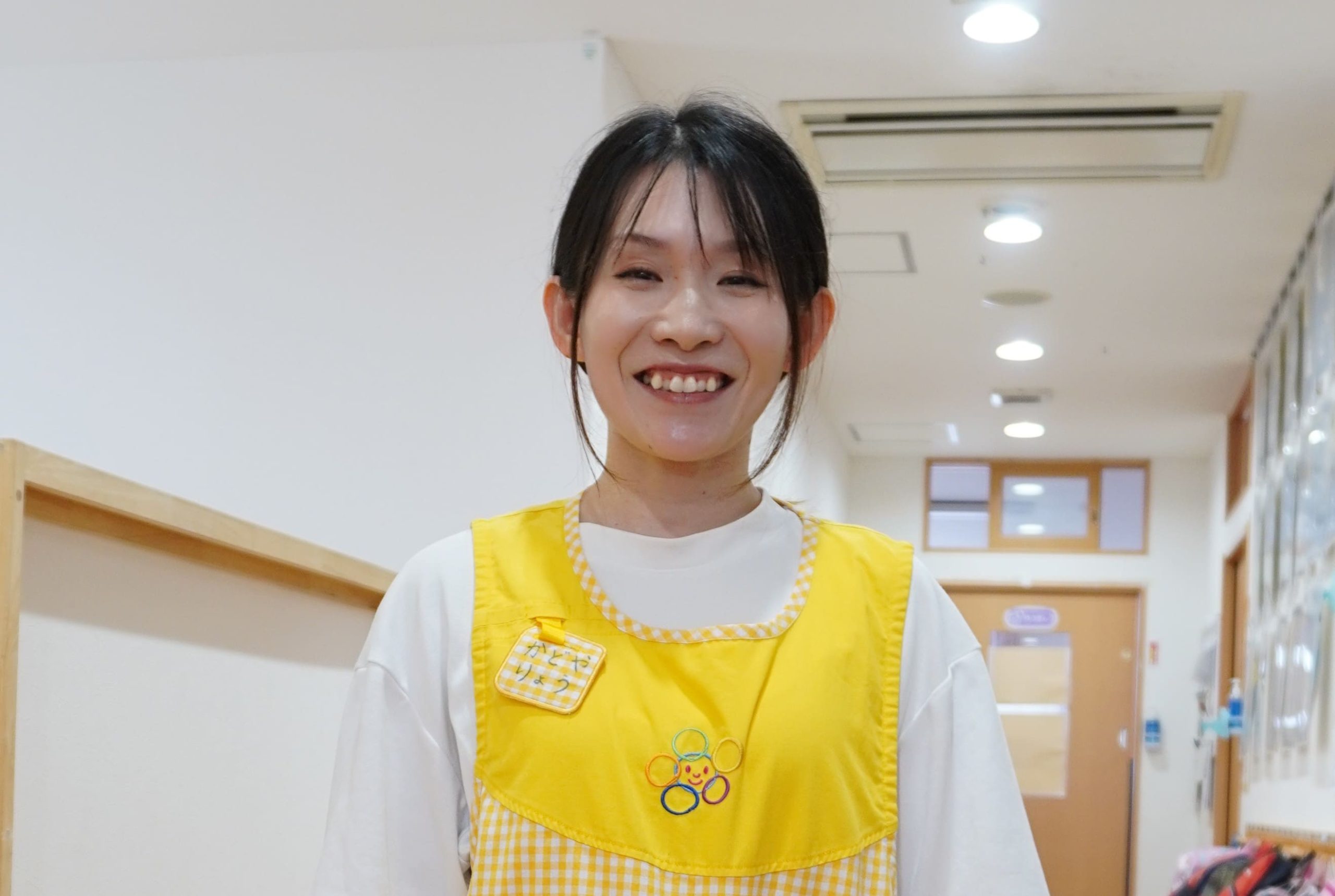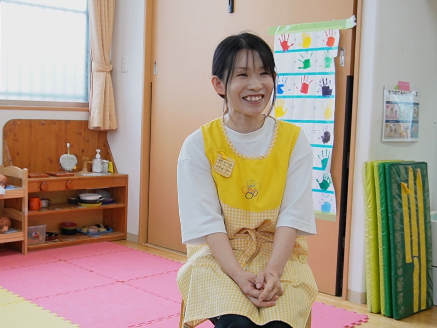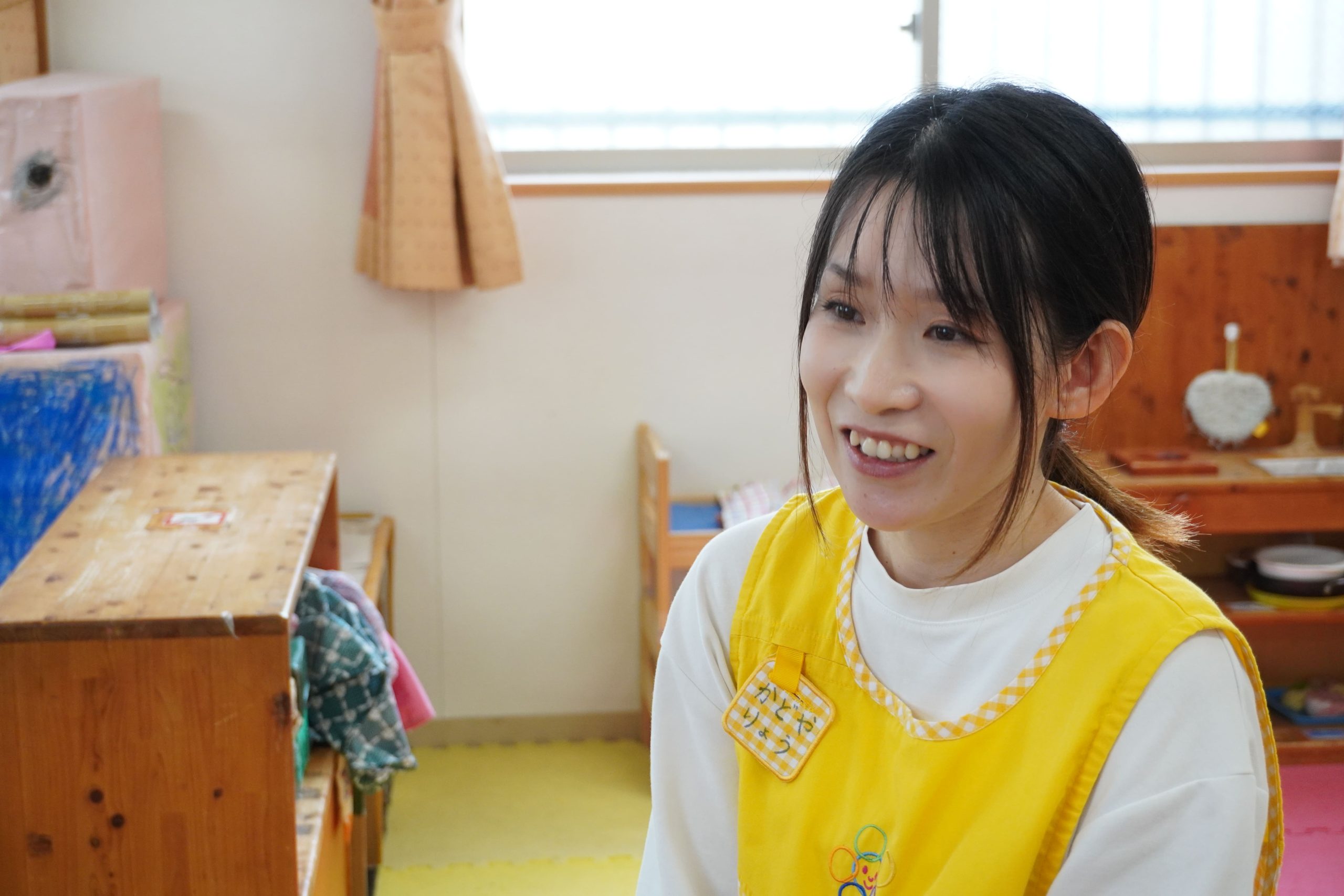 「もともと大学では教職を取っていて、教員にもなりたいなと思っていたんですけれども、教員になるにあたっ て、もっと小さな子どもからの子どもたちの成長、というか、人間の成長ってどういうものなのかなっていうのを 知りたいという想いから、0 歳児がいる保育園で働いてみたいと決意したんです」。