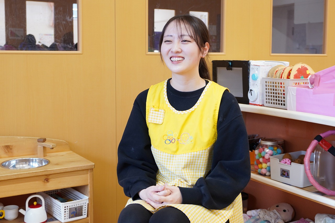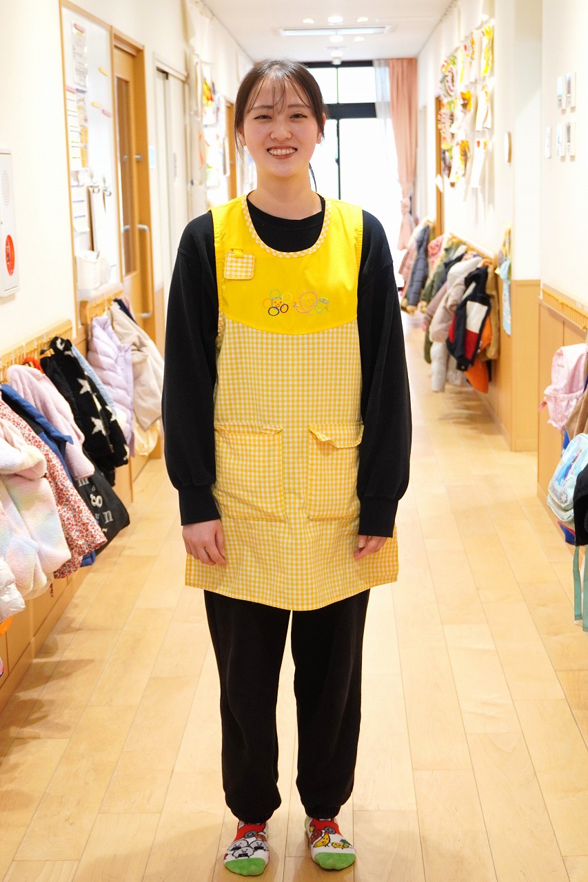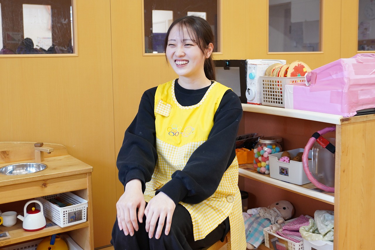 「分からないことは、先輩たちが教えてくれたり、聞きやすい雰囲気もあって、本当に助けられています。特に、保育の中での子どもへの声のかけ方とか、私が苦手な書類やクラスだよりの作り方とかも、ちゃんと細かく教えてくれます。」