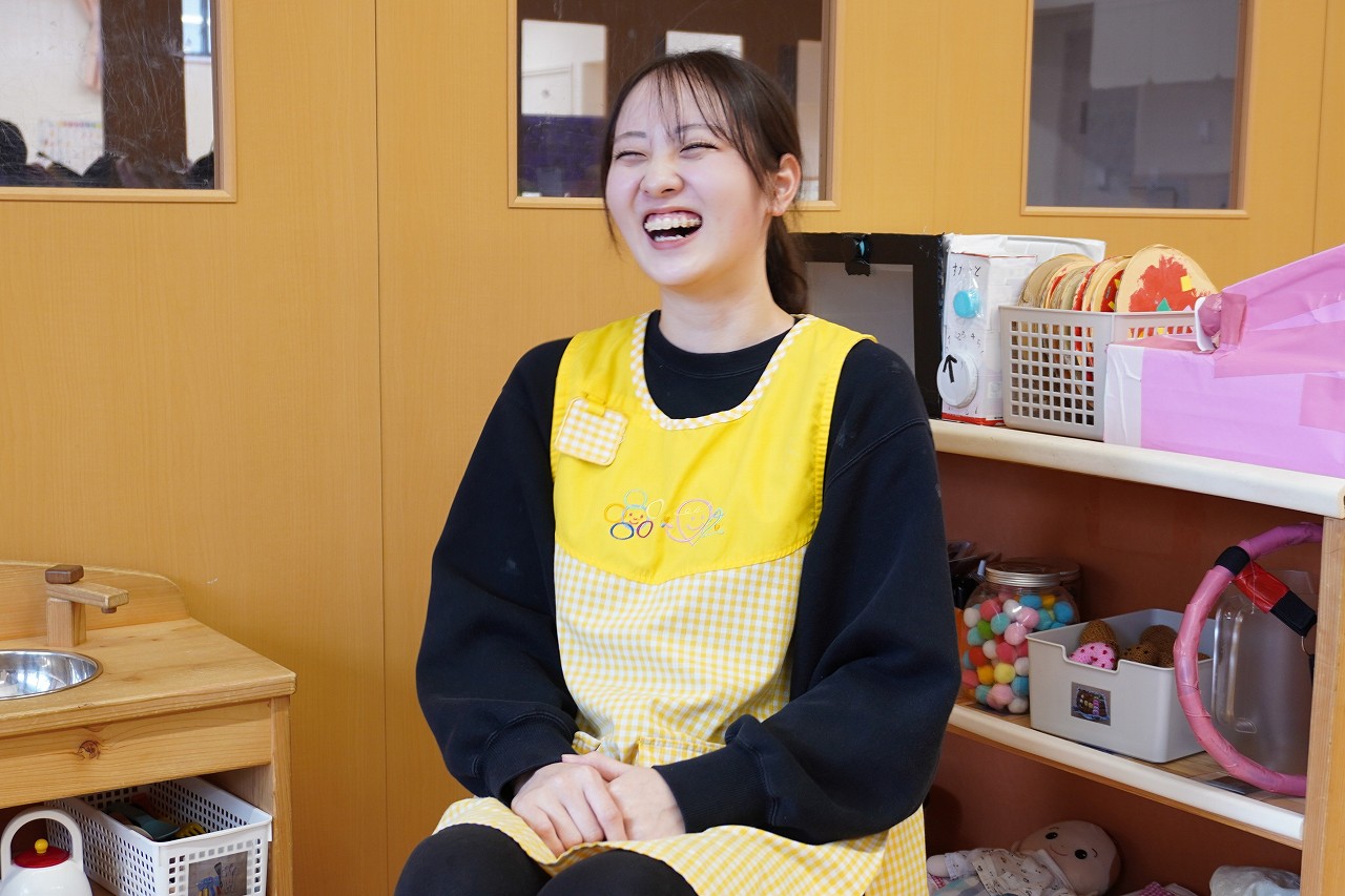 「朝、登園して子どもたちを受け入れて、日中は色々な活動を一緒にしたり、食事の介助をしたり、お昼寝を見守ったり。子どもたちが帰るまで一緒に遊んでいます。」