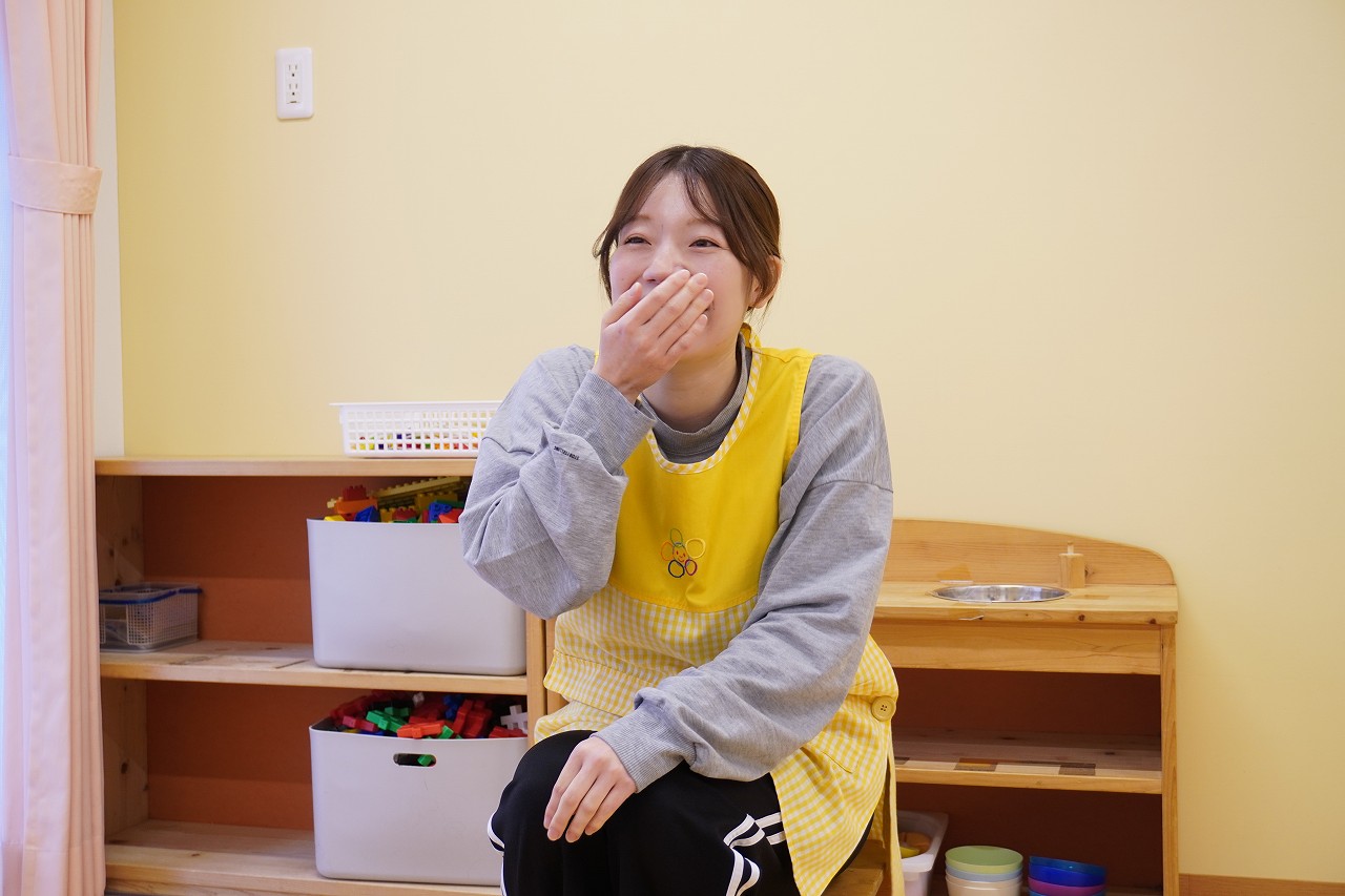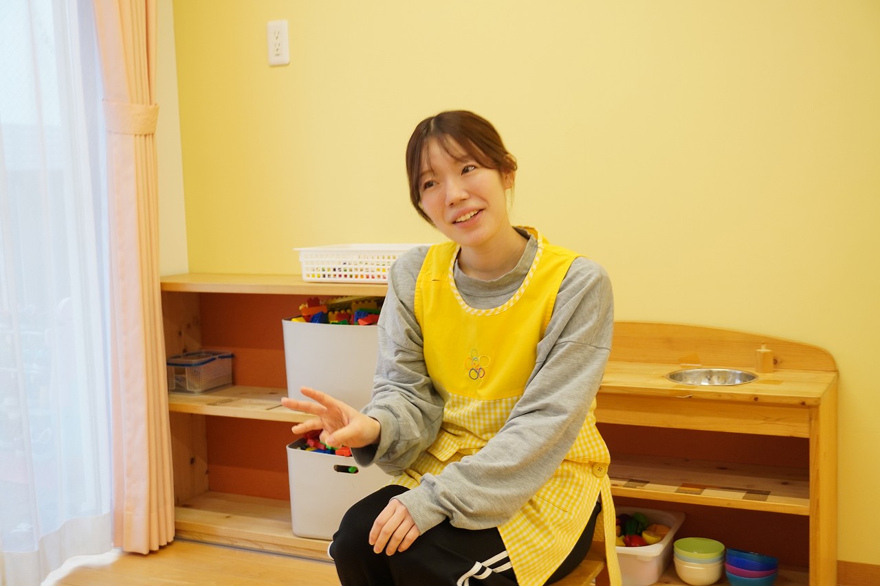 「乳児クラスを担当していた時は、少しずつ『ありがとう』が言えるようになったり、意味がわかってくるという段階でした。その中でも、私がしたほんの小さなこと、例えば『固いブロックを外した』『ズボンの向きを直した』だけでも、『ありがとう』と言ってくれます。意味を持った『ありがとう』を言えるようになった子どもたちからの『ありがとう』は、すごく嬉しいものがあります。」