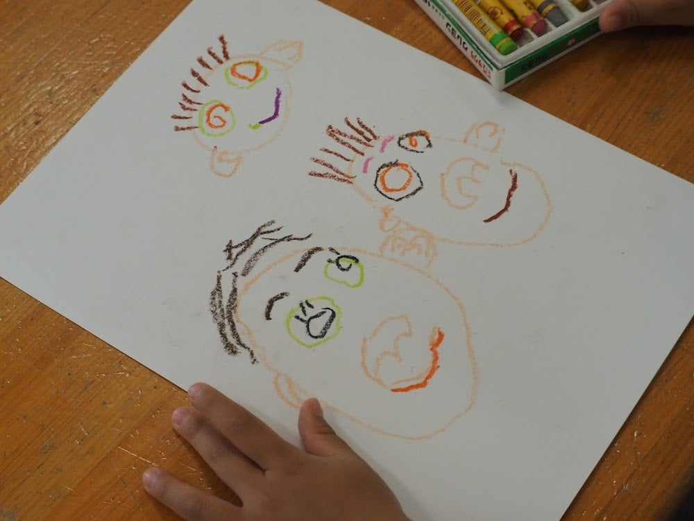 紙芝居で学んだあとは、家族の似顔絵を描いていきました。普段からお絵かきが好きで得意な子、どこから書き始めればいいか分からないと悩む子、描くペースはそれぞれです。ただいつもと違うのは、目と口はあるのに鼻を描いていないことに気付いたり、髪の毛の長さを描き分けたり、どれが誰か分かるように家族の特徴をつかんで描いていました。